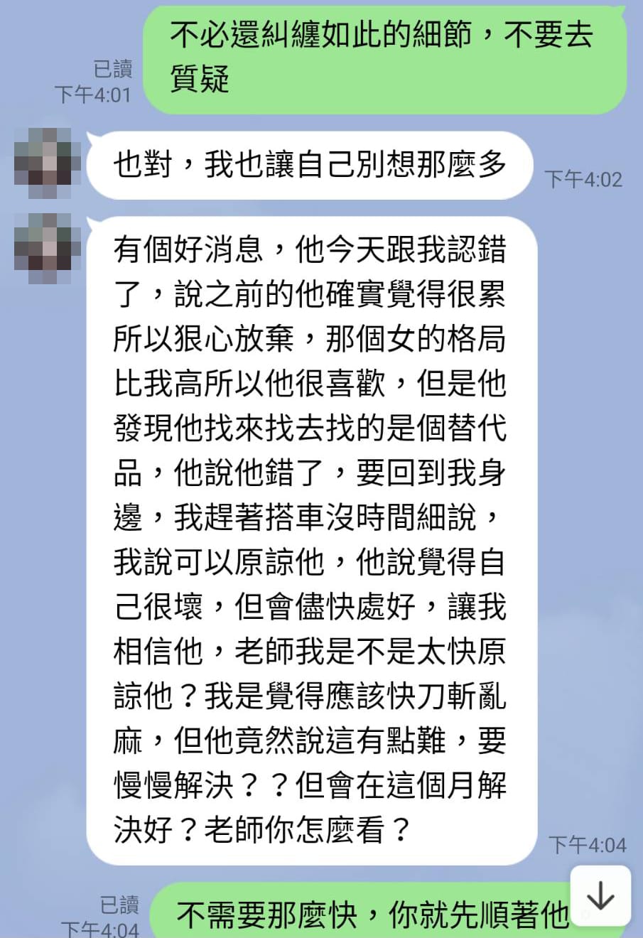四、情感建議:除了上述的對策,我們更有資深專業的感情導師,診斷您們感情失和的原因,提供最佳的復合方案,分析雙方誤解的根源,提升自我情商,並根據調查狀況建議您每天最適合的表現,快速的讓您們破鏡重圓,重歸於好。